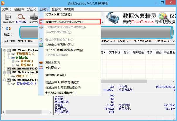 1、下载Diskgenius分区工具,然后打开选中目标u盘,接着点击“工具--搜索已丢失分区(重建分区表)”,如下图所示: