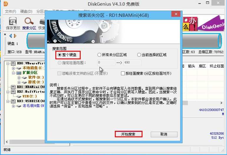 2、搜索范围选择“整个硬盘”,点击“开始搜索”按钮,如下图所示:
