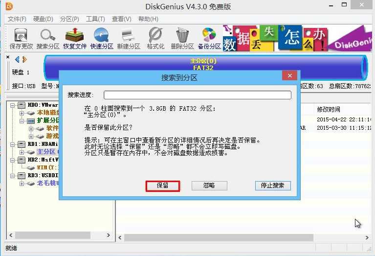 3、搜到到目标分区后,点击“保留”即可,如下图所示: