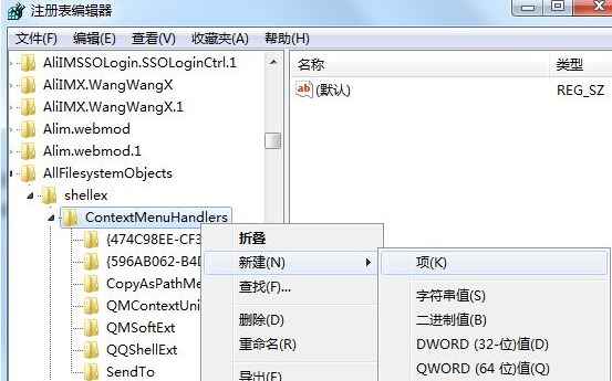2、在注册表编辑器中,依次打开HKEY_CLASSES_ROOT\AllFilesystemObjects\shellex\ContextMenuHandlers\,然后在该键值上点击鼠标右键,选择“新建→项”(如下图),并将项值命名为“{C2FBB630-2971-11D1-A18C-00C04FD75D13}”(不包含双引号),这是在鼠标右键菜单里添加“复制到文件夹”菜单。