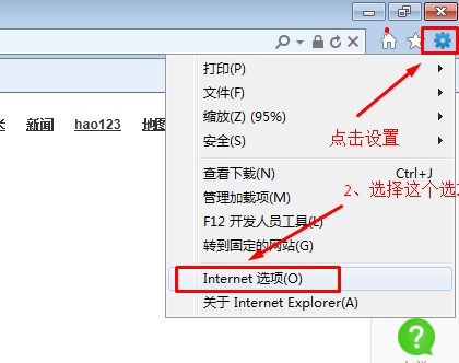 1、打开IE浏览器,然后点击菜单栏上的“工具”按钮,再选择下拉菜单中的“Internet选项”打开如下图;