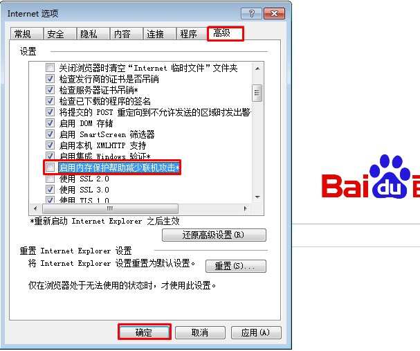 2、然后点击Internet选项中的高级选项卡上,找到“启用内存保护帮助减少联机攻击”项,将前面的复选框内的勾取消掉。然后再关闭浏览器又重新打开;