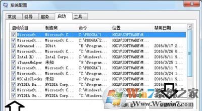 4、重启电脑,如果出错的提示不出现了,那就是启动项的问题→定位到启动→逐一找到故障启动项→取消选中对勾→确定→问题得以解决,如果不确定选择全部禁用→确定也可以解决问题(随机启动项越少,开机越快);