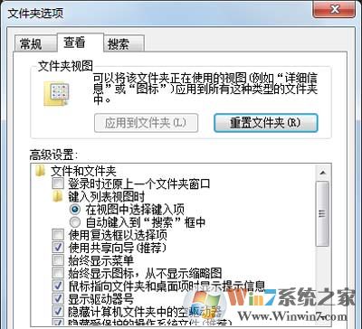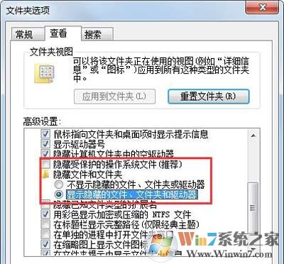 7、也可以打开任意一个文件夹→查看→选项→文件夹选项→查看→高级设置→取消:隐藏受保护的操作系统文件(推荐)前的选中对勾→再点选显示隐藏的文件、文件夹和驱动器→确定。