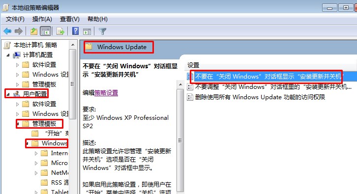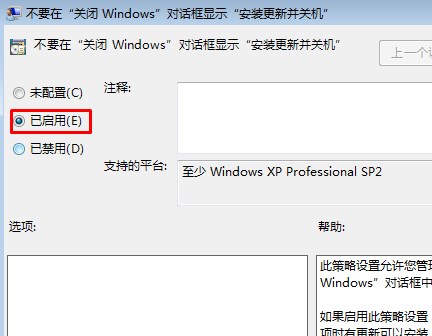 3、从右侧窗格中找到“不要在‘关闭Windows’对话框显示‘安装更新并关机’”项,双击打开其属性窗口,在其属性窗口中选择“已启用”,确认退出即可生效。