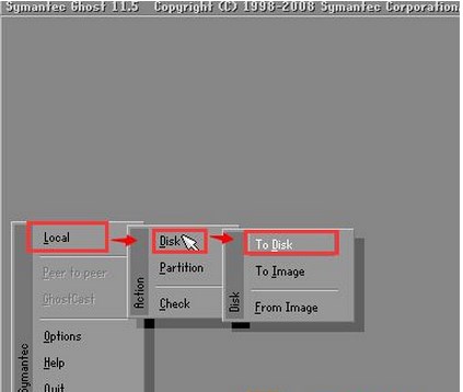 3、打开Ghost 后,使用键盘选择 Local ——》disk ——》Disk;