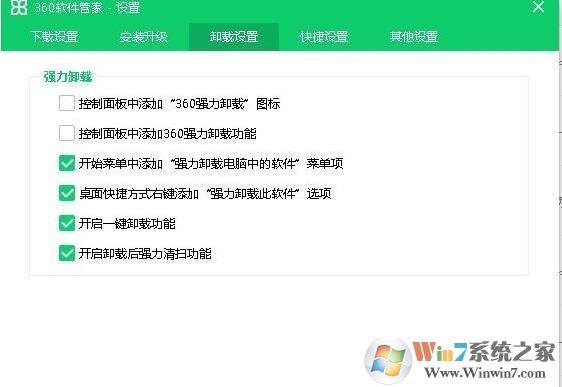 2、随后会进入“360软件管家- 设置”窗口,切换到“卸载设置”选项,在下面将“控制面板中添加360强力卸载图标”和“控制面板中添加360强力卸载功能”两项的勾选状态取消,如果不想右键菜单有此选项,那么也可以取消勾选“桌面快捷方式右键添加“强力卸载此软件”的选项”
