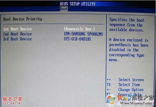 上图2-22 :启动优先级设备选择(Boot Device Priority)在第一启动设备(1st Boot Device)里选择硬盘Hard Disk Drives(具体的要看硬盘的型号,例如图片里面应该选择PM—SAMSUNG SP0802////N)。