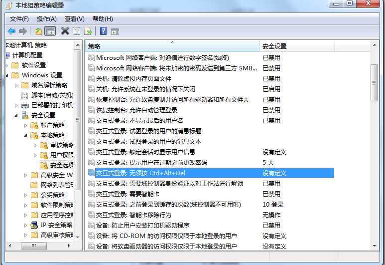 2、依次展开:计算机配置——》Windows设置——》安全设置——》本地策略——》安全选项,找到 交互方式登录:无须按CTRL+ALT+DEL ;