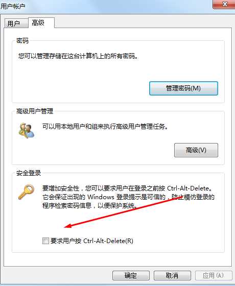 2、然后在高级选项卡下把“要求用户按ctrl+alt+del”前面的勾去掉。确定后就可以了