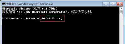 2、输入“chkdsk X: /f”命令,“f”是磁盘的盘符,大家改成自己u盘的盘符即可,然后按下回车键执行;