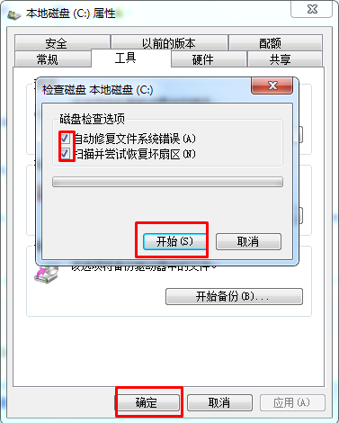 2、选择工具标签,点击查错里的开始检查,然后勾上下图红框内的两个选项,并点击开始;