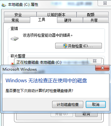 3、一般检查修复C盘,可能无法在系统运行中进行,所以系统会询问是否在下次系统启动时进行,我们点是就可以了,然进重启一下系统,在登录win7前会进行系统检查修复。
