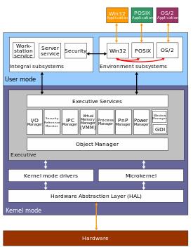 Windows NT采用的核心是属于混合核心。其体系结构包括简单内核、硬件抽象层(HAL)、驱动程序、服务(总称为运行体), 这些均属于核心模式。用户模式下的程序与子系统仅能访问其可访问的资源,核心模式下的程序则可以访问所有资源与外部设备。