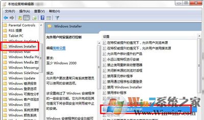 2、在本地组策略编辑器依次展开到“计算机配置--管理模板--Windows 组件--Windows Installer”,任何在右侧窗口找到并双击打开“允许用户对安装进行控制”策略;