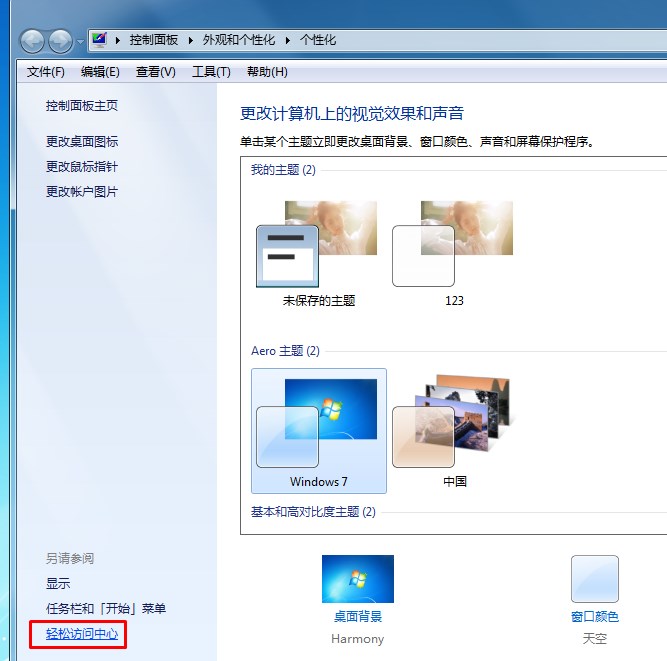 1、右键点击“个性化”,然后在个性化中找到“轻松访问中心”打开;