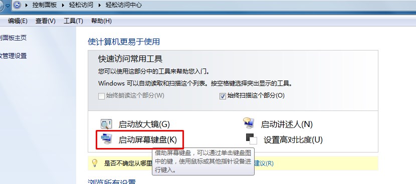 2、启动“屏幕键盘”,然后就可以使用屏幕键盘来在运行中输入 regedit了。