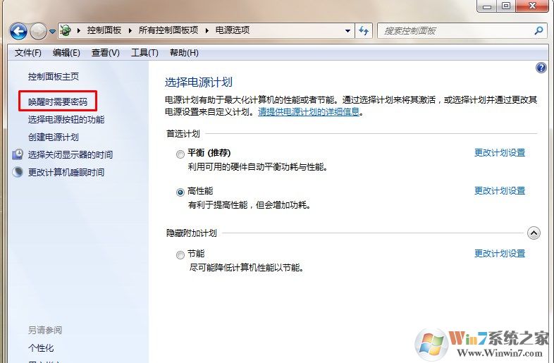 3、在左侧找到唤醒时需要密码,点击进入下一个选项