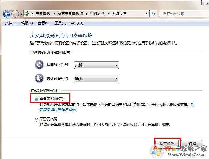 4、选择唤醒时需要密码,最后点击保存修改即可