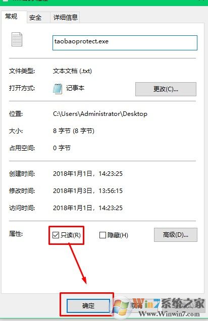 4、新建一个文本文档,放入该文件夹,然后命名为taobaoprotect.exe。右键该文档属性,勾选只读属性即可。最后确定关闭。