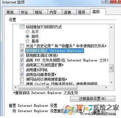 4、切换到“高级”选项中将“禁用脚本调试(Internet Explorer)”和“禁用脚本调试(其他)”选项打上勾选,点击应用,如图所示: