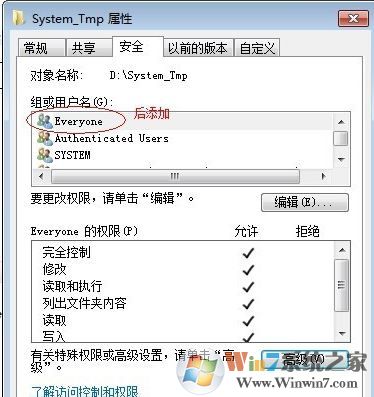 5、重新打开临时文件夹属性,切换到【安全】选卡,然后在下面选中【Everyone】 ,然后在下面权限 所有权限勾勾选 【允许】,确定 即可!