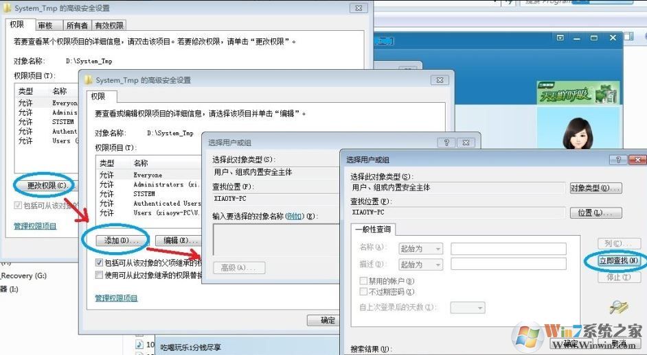 4、然后点击【更改权限】,点击【添加】,点击【高级】--【立即查找】;