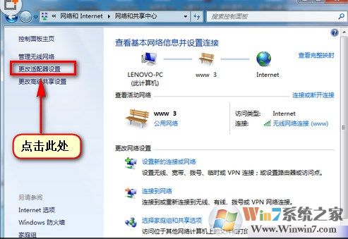 3、 点击左侧“更改适配器设置”;