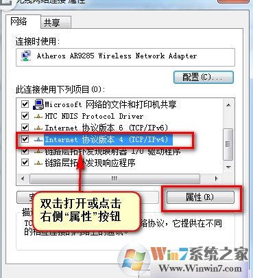 4、 在“无线网络连接”右击选择属性,在弹出界面点击“internet协议版本4(TCP/IPv4)”,双击此项目或点击“属性”按钮;