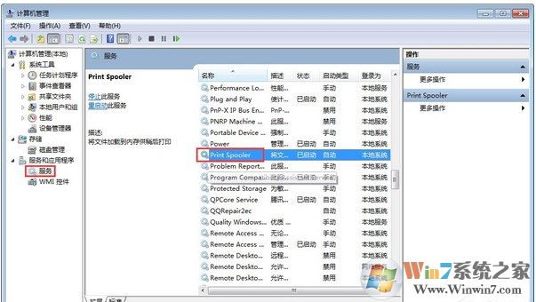 2、在打开的“计算机管理”窗口中,依次展开“服务和应用程序”-》“服务”,并在右击找到并双击“Print Spooler”项。