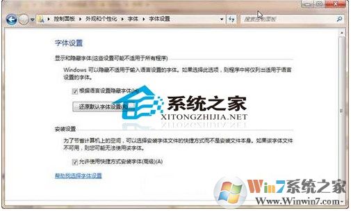 首先,在刚才的界面上点击“字体设置”(如上图),进入字体设置界面,勾选“允许使用快捷方式安装字体(高级)(A)”。