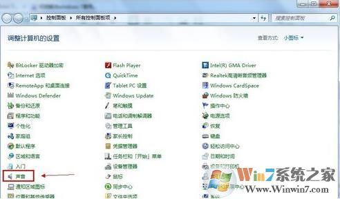 1、单击“开始”菜单,单击“控制面板”项,单击“声音”项。