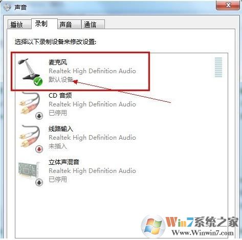 3、切换到“录制”选项卡,看看麦克风是否被设置为默认设备(注:有的声卡可能会显示多个麦克风选项)。