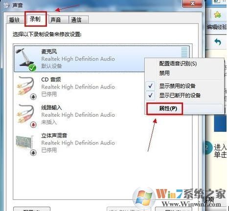2、进入“声音”对话框,切换到“录制”选项卡,直接双击“麦克风”选项或鼠标右键单击“属性”命令。