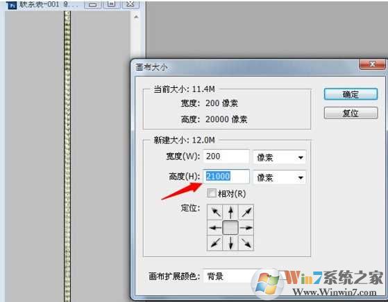 6、接着,为了下面的2次拼接,我们需要增加画布长度,现在我们再点击第二张画布。就是100张图片那张。把20000改成21000,增加长度。以便把第一张画布的五张图片加入合成。