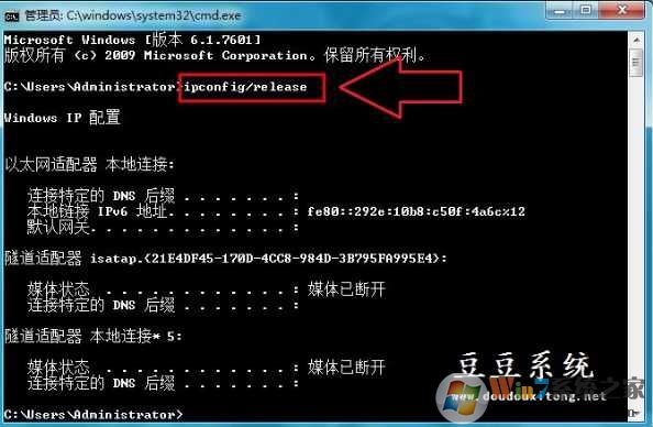2、打开命令提示符窗口后并输入“ipconfig/release”命令按回车键(如下图所示),等待命令执行完成后重启电脑即可修复当前网络问题。