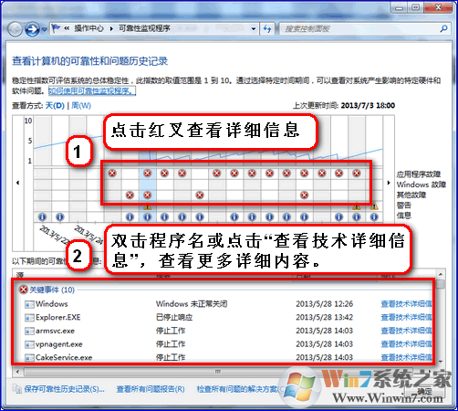 2. 点击红叉部分,就会显示出现异常的程序,然后双击程序名或点击“查看技术详细信息”查看更多详细错误信息。