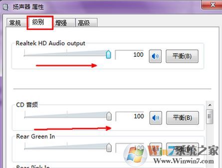4、切换到“级别”选卡,可将其调节到最大,然后将下面的那些音量调节通通调到最大然后点击确定保存设置即可!