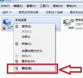 4、在“本地连接”上,然后点击鼠标右键,在弹出的选项当中,选择“属性”;