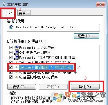 5、到这里我们就可以打开Win7本地连接属性了,在里边即可更高本地连接IP地址了,如下图所示,我们切换到网络一栏,然后选中“ Internet 协议版本4 ”,然后点击下边的属性,如图所示: