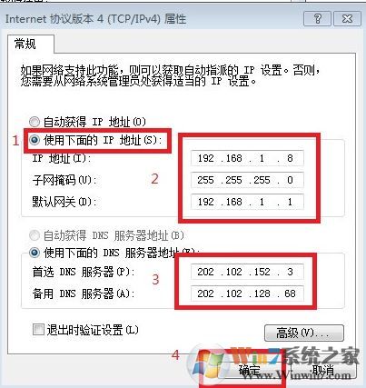 注意:以下IP地址在没有路由器的情况下添写电信提供的 IP地址等信息,如果已经安装有路由器,那么只是按需要给自己的电脑设置一个IP地址。(不懂的朋友可以学习网关怎么设置?IP设置里的默认网关要怎么填? 这个教程)