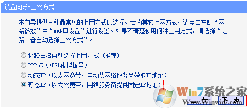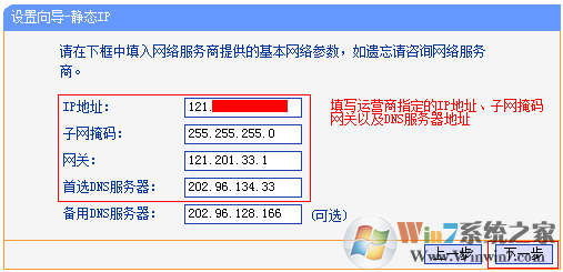 填写运营商指定的IP地址、子网掩码、网关以及DNS服务器地址。点击 下一步: