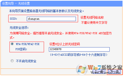 SSID即无线网络名称(可根据实际需求设置),选中 WPA-PSK/WPA2-PSK 并设置PSK无线密码,点击下一步。