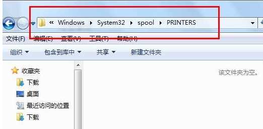 3、依次打开 C:\Windows\System32\spool\PRINTERS 目录,将里面所有的文件删除;