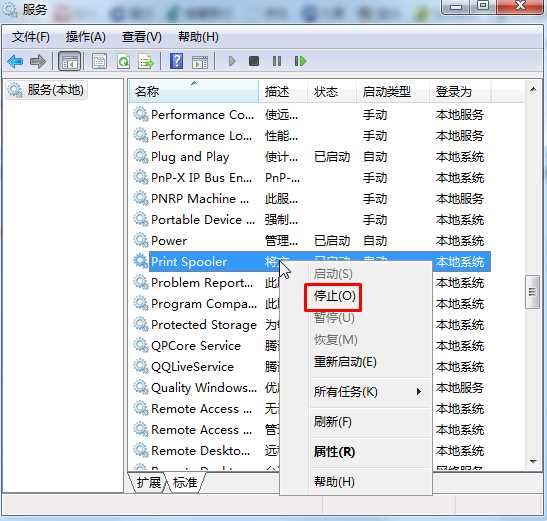 2、在右侧将“printspooler”服务单击右键,选择“停用”;
