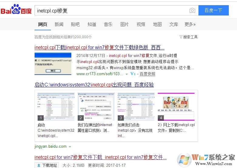 到百度搜索一下inetcpl.cpl for win7修复文件,下载并安装进行修复,这样就能解决问题了