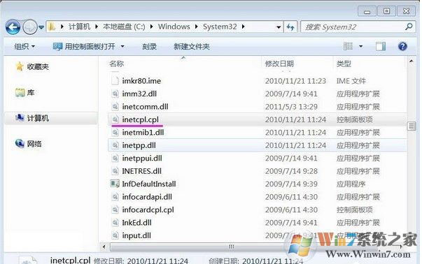 1、打开计算机C盘---windows---system32,找到inetcpl.cpl文件,鼠标左键点击inetcpl.cpl。