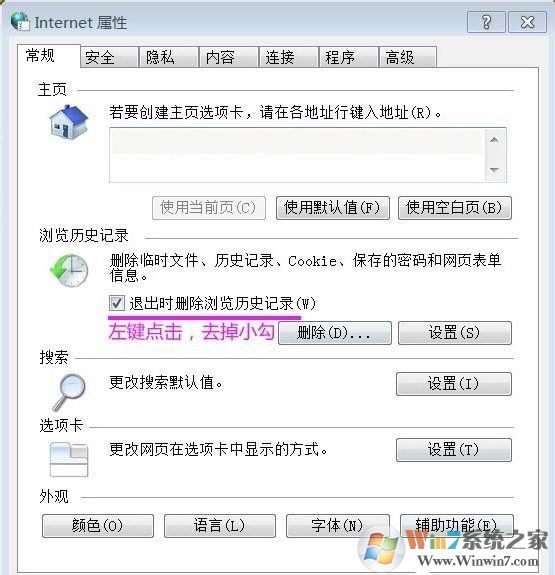 2、我们在弹出的Internet属性窗口找到浏览历史记录,左键点击退出时删除浏览器历史记录,去掉前面小框内的小勾,再点击确定。