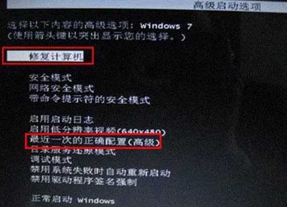 1、重新开机,一直连续按下“F8”键,在“高级启动选项”中,选择“修复计算机——最后一次正确配置”。