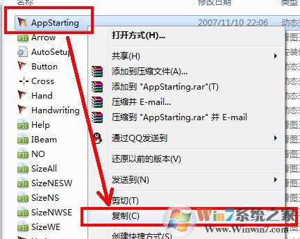 3、打开解压好的文件夹,选择鼠标指针文件点击鼠标右键选择复制,如图: